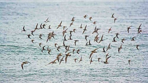 今朝の浜辺 ハマシギ(小) キアシシギ(中) チュウシャクシギ(大) 飛んでました 5月2日 ホオジロ、ムクドリ、ヒヨドリ、イソヒヨドリ、アカハラ、メジロ、ウグイス、 コゲラ、キビタキ、ハシボソガラス、シメ、ツバメ、シロチドリ、カルガモ、ドバト、 カイツ…